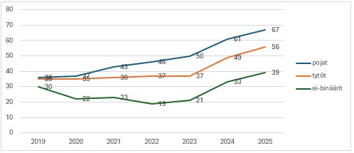 Vuoden 2025 kyselyaineisto osoittaa nuorten uskon vahvistuneen edelleen kysyttäessä uskoa Jumalan olemassaoloon tai Jeesuksen ylösnousemukseen (ks. kuviot 1 ja 2). Ilmiö näkyy vuoden 2024 aineiston tavoin sekä tytöillä, pojilla että ei-binääreillä nuorilla. Poikien uskon vahvistuminen on näkynyt kyselyssä jo vuodesta 2020 lähtien. Vuonna 2020 rippikoulupojista 36 prosenttia kertoi uskovansa Jumalan olemassaoloon, vuonna 2025 osuus oli peräti 67 prosenttia. Tyttöjen keskuudessa vastaavana aikana osuus on kasvanut 35 prosentista 56 prosenttiin. Ei-binääristen nuorten keskuudessa Jumalaan uskovien rippikoululaisten osuus on kasvanut noin joka viidennestä nuoresta yli kolmannekseen. Vastaavana aikana nuorten osallistuminen rippikouluun vähentyi vain noin neljä prosenttiyksikköä, joten nuorten erilainen valikoituminen rippikouluun tai kyselyyn vastaajiksi ei selitä näin isoa muutosta.