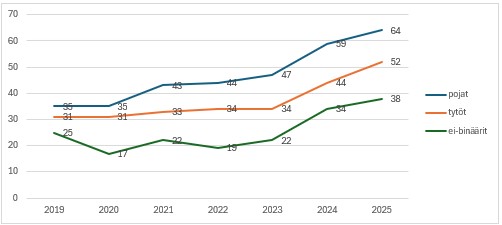 Laajan otoksen ansiosta kyselyn perusteella voidaan saada myös harvinaista kvantitatiivista vertailutietoa ei-binääreistä, sukupuolivähemmistöihin identifioituvista nuorista. Heitä on aineistossa yli 1 500. Useimmiten tämän vastaajaryhmän vastaukset joudutaan jättämään pois analyysista pienen vastaajamäärän vuoksi.