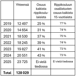 Vuodesta 2019 vuoteen 2024 rippikouluun osallistuvien nuorten osuus on vähentynyt neljä prosenttiyksikköä, 77 prosentista 73 prosenttiin. Vaikka lasku on pieni, se on syytä ottaa huomioon tuloksia arvioitaessa. Vuoden 2025 osalta tulokset ovat alustavia, sillä jonkin verran rippikouluja on tätä kirjoitettaessa vielä kesken. Kyselyn vastaajamäärä syyskuun alkuun mennessä on kuitenkin jo suurempi kuin edellisenä vuotena, joten kyselyn kattavuus on edelleen vahvistunut.